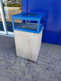Il gettacarte è costituito da una base di forma quadrata, munito di una struttura superiore sagomata che funge da coperchio e posacenere in lamiera zincata verniciata disponibile in varie colorazioni. La base è realizzata in cemento armato, vibrato e sabbiato, trattato con antidegrado, disponibile in tre colorazioni: grigio, bianco e tipo pietra lavica.